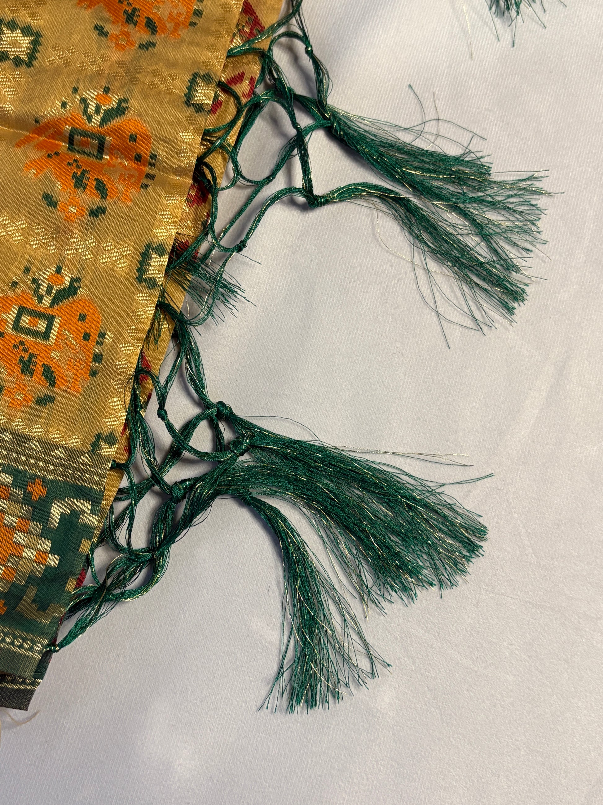 A celebration of tradition reimagined through modern technique, this Patola-style silk satin blend dupatta features an all-over digital print that mimics the intricacy of woven art. The golden base is adorned with symmetrical motifs in red, orange, and green—stylized florals and geometric patterns arranged in a rhythmic grid. A contrasting border in deep green frames the piece with ornate detailing, while soft tassels add movement and charm. Lightweight blended art silk & satin blend with a subtle sheen. Decorative border and knotted tassels for a complete look