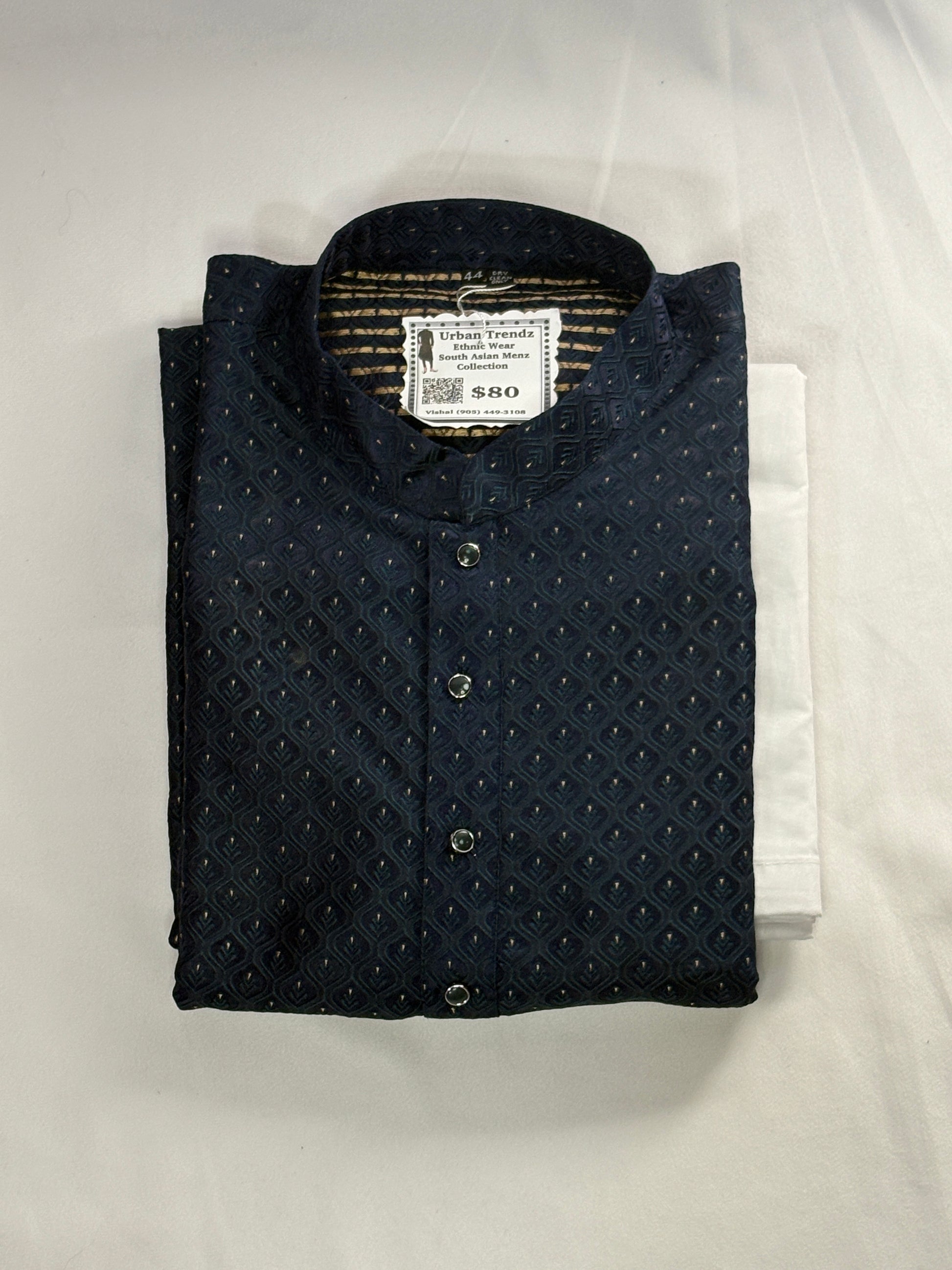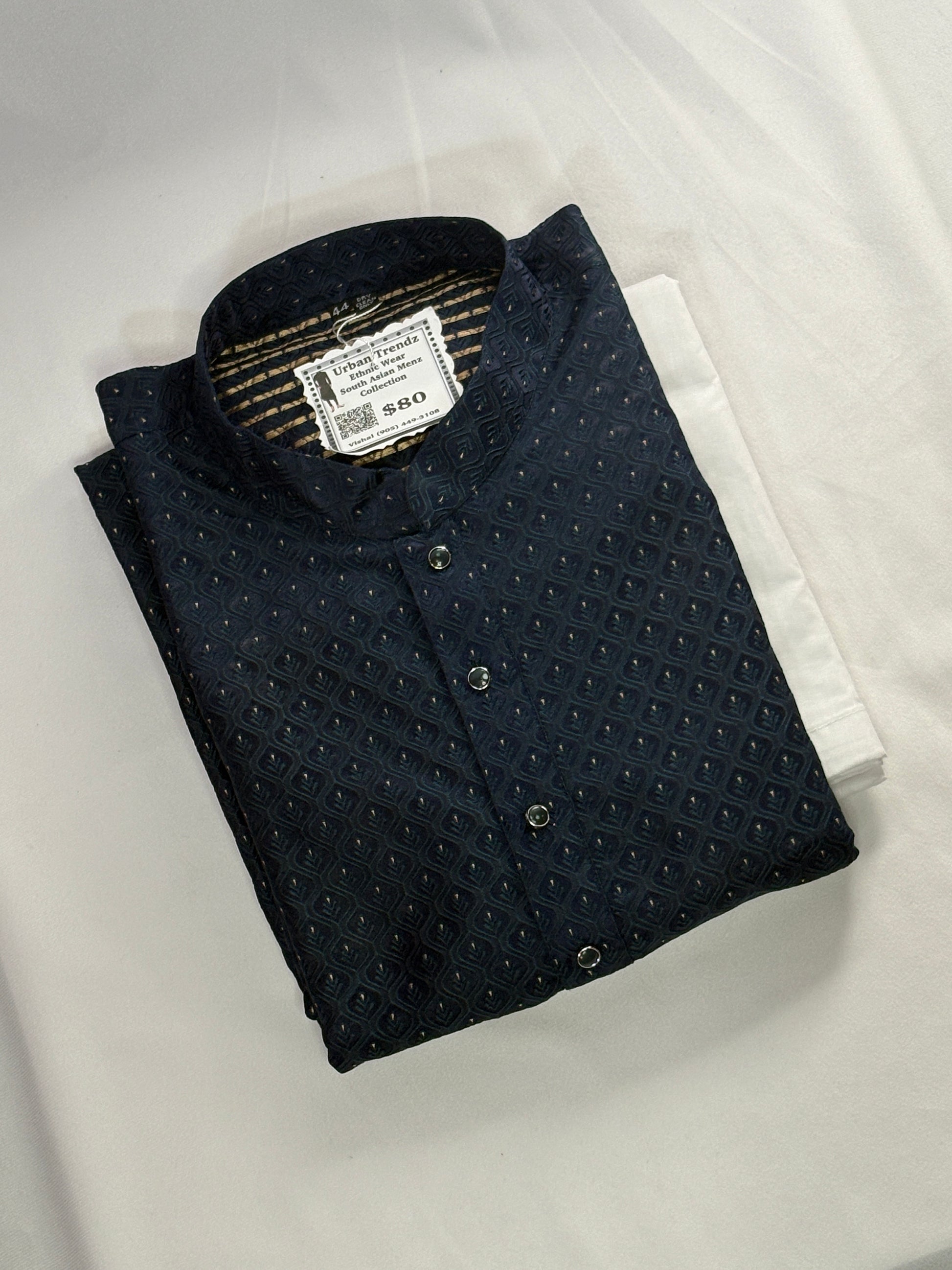 This is a stunning kurta with a rich, sophisticated color palette! Here's what makes it special with over textured pattern with small diamond or geometric motifs embossed into the fabric. Delicate golden or light-colored dotted accents throughout, adding sparkle and dimension. The fabric has a luxurious sheen that enhances the two-tone peacock effect. Mandarin collar (band collar) in traditional South Asian style. Front button placket with elegant silver-toned buttons. The collar features a contrasting striped lining in gold and dark tones, adding an extra touch of sophistication