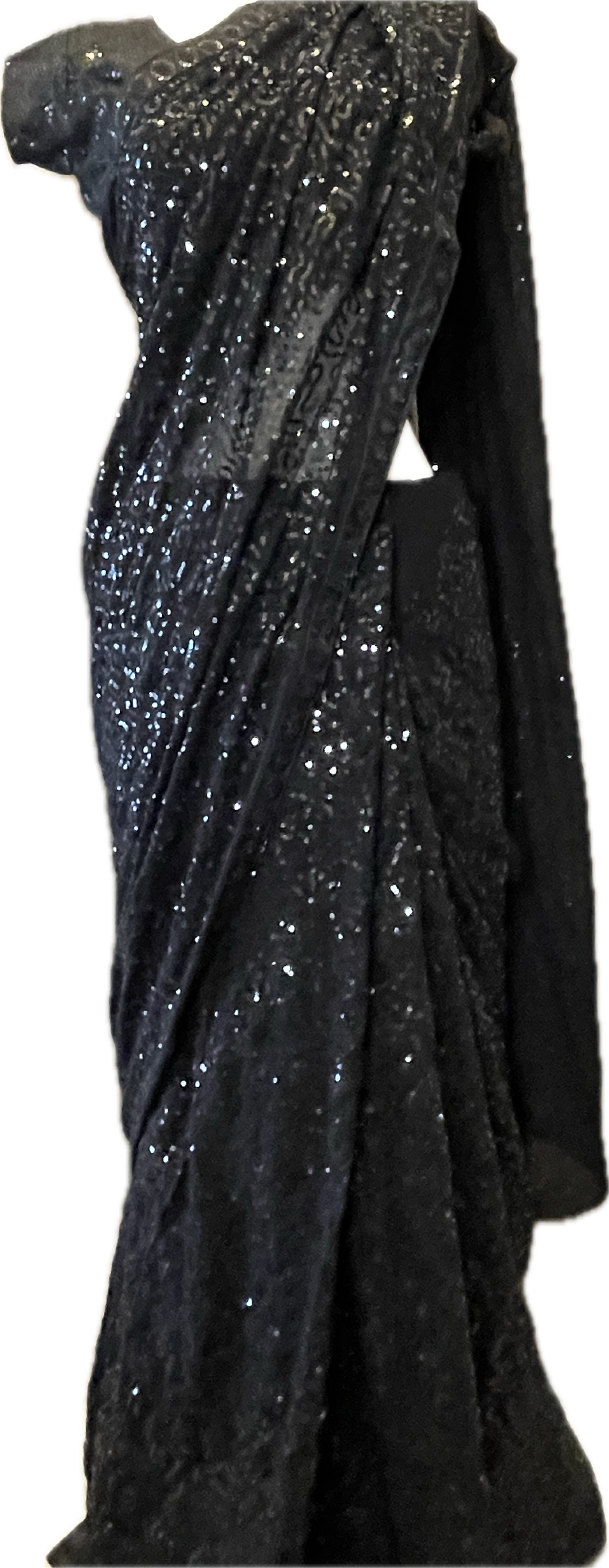 This stunning black sequins saree is a masterpiece of craftsmanship and glamour. Each delicate sequin catches the light beautifully, creating a mesmerizing shimmer that transforms you into the center of attention at any celebration. Premium sequin embellishment throughout the drape. Georgette fabric that flows gracefully with every movement. Versatile black shade perfect for weddings, galas, and festive occasions. Timeless design that transcends seasonal trends.