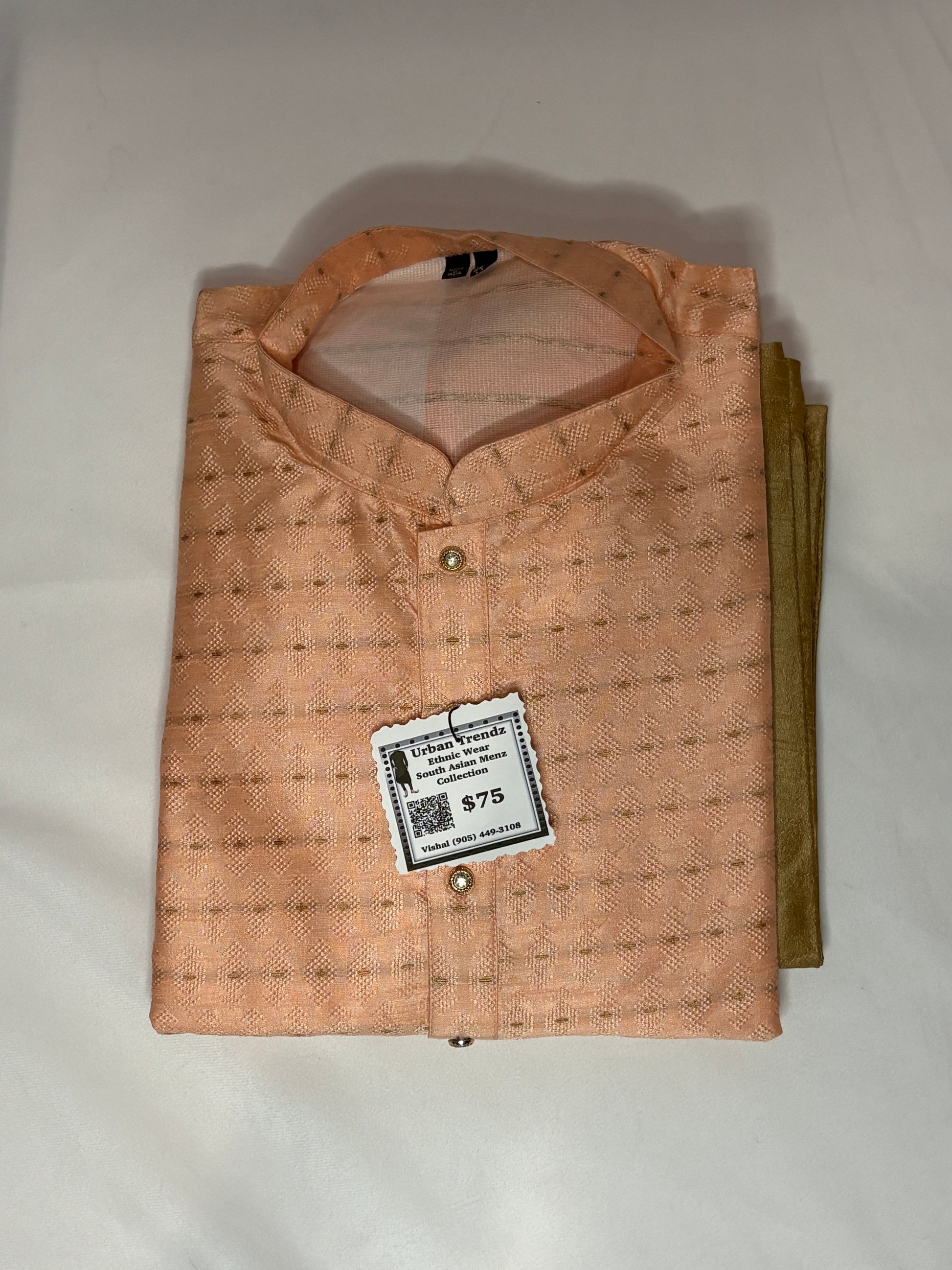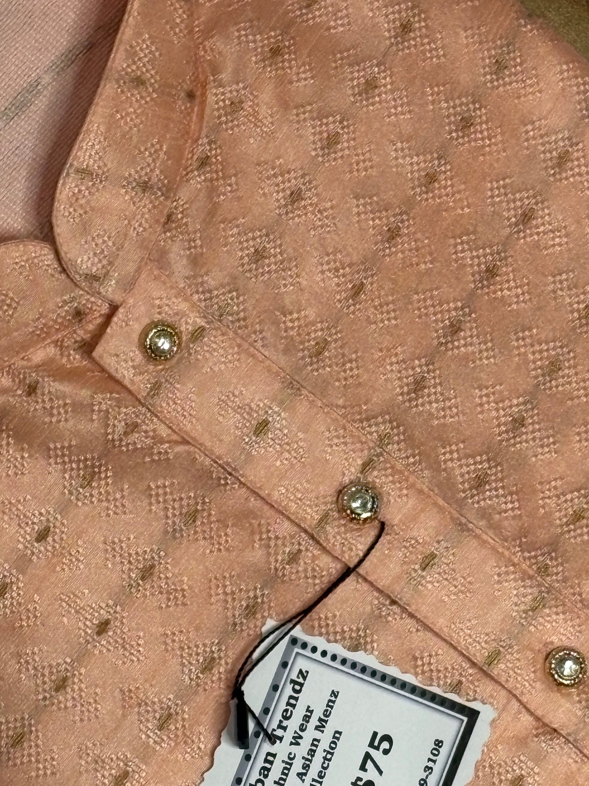 Luxurious jacquard weave with all-over geometric diamond motifs in golden threadSophisticated peach-beige base color that complements all skin tones. Classic mandarin collar with traditional button placket. Premium quality fabric with subtle sheen and rich texture. Full-length sleeves perfect for formal occasions.