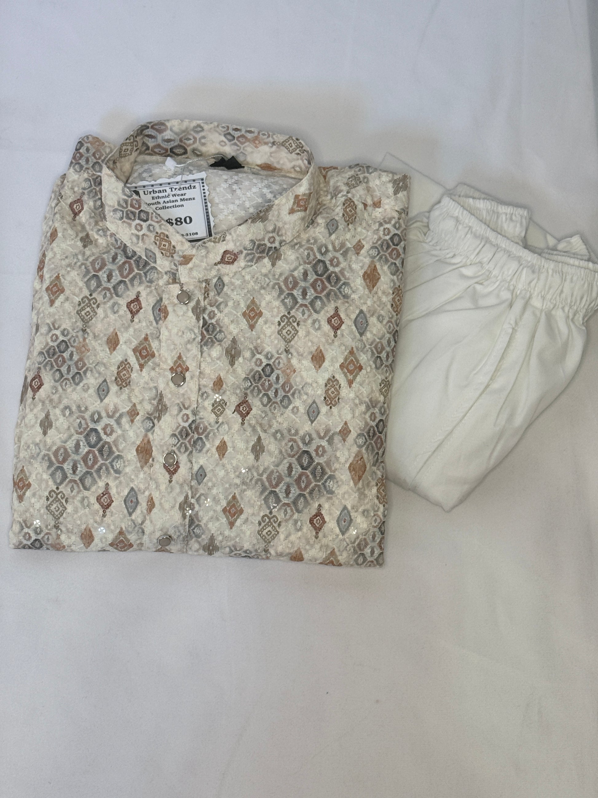 Elevate your wardrobe with this meticulously light brown/beige kurta with White colour pajama, featuring a striking geometric diamond pattern in shades of blue and white. Intricate geometric diamond and hexagonal motif with a sleek mandarin collar and finished with elegant pearl look alike buttons, this piece blends traditional artistry with modern sophistication. Perfect for festivals, celebrations, and cultural gatherings.This kurta pajama set combines timeless elegance with contemporary style, making it an essential addition to your ethnic wear collection. Cotton fabric for all-day comfort.