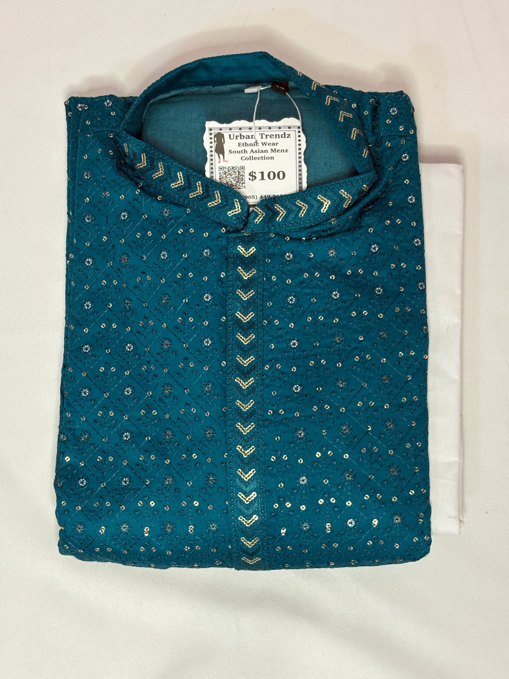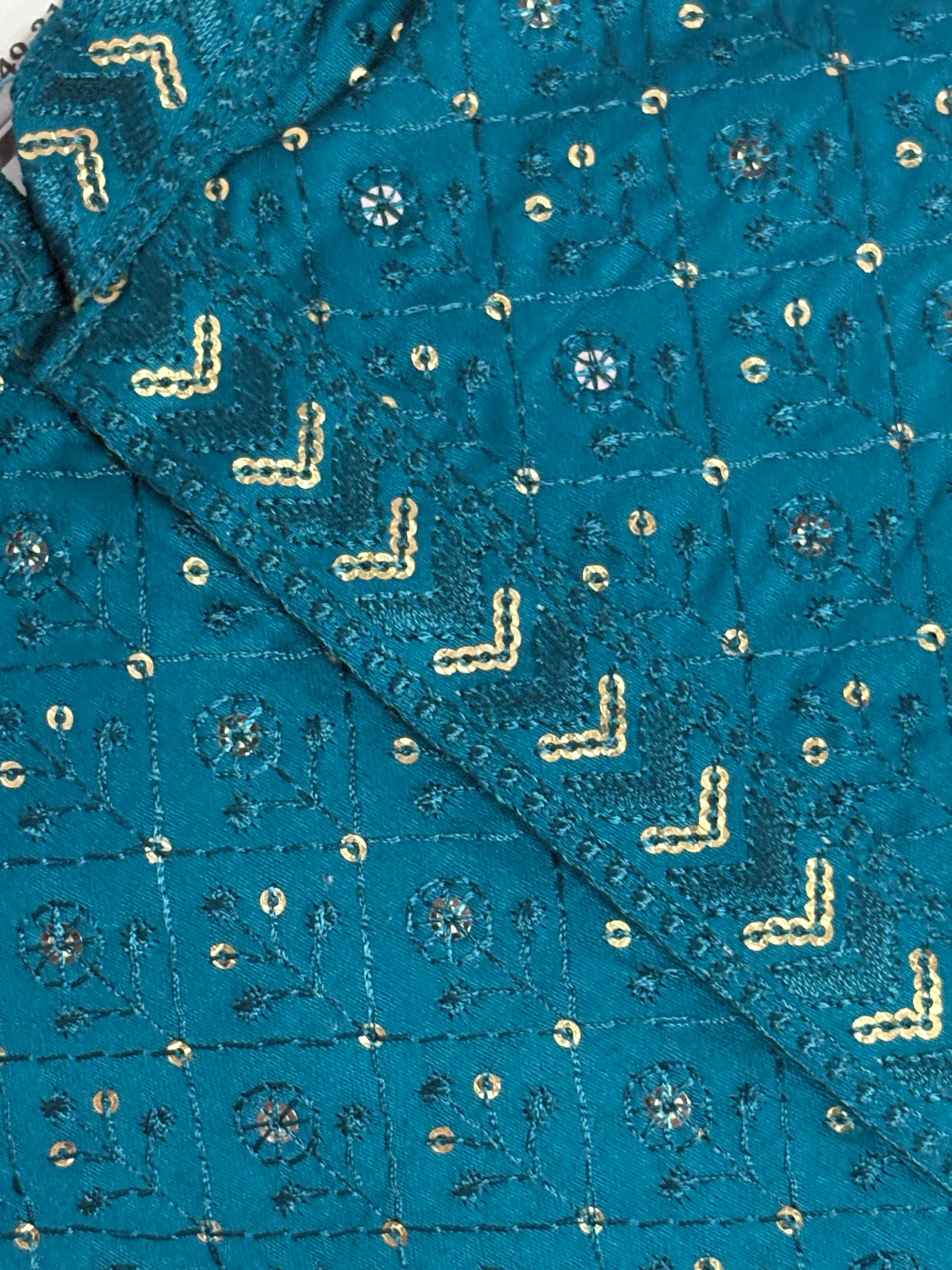 Make a dazzling statement at your next celebration with this stunning sequined kurta pajama set in rich teal blue, complete with a luxurious golden pajama. Gorgeous teal blue kurta adorned with shimmering sequins and embellishments. Intricate sequin work featuring elegant chevron patterns down the center placket. All-over scattered sequin detailing for maximum sparkle and glamour. Complementary golden pajama for a regal, coordinated look. Premium quality fabric with comfortable lining. Perfect for weddings, sangeet, engagement parties, and festive celebrations. Stand-out party wear that captures attention. This party wear kurta pajama set is designed to make you shine at any celebration. The rich teal blue color provides a sophisticated backdrop for the sparkling sequin embellishments, while the golden pajama adds a touch of royal elegance. The intricate sequin work features beautiful patterns that catch the light beautifully, ensuring you'll be the center of attention.