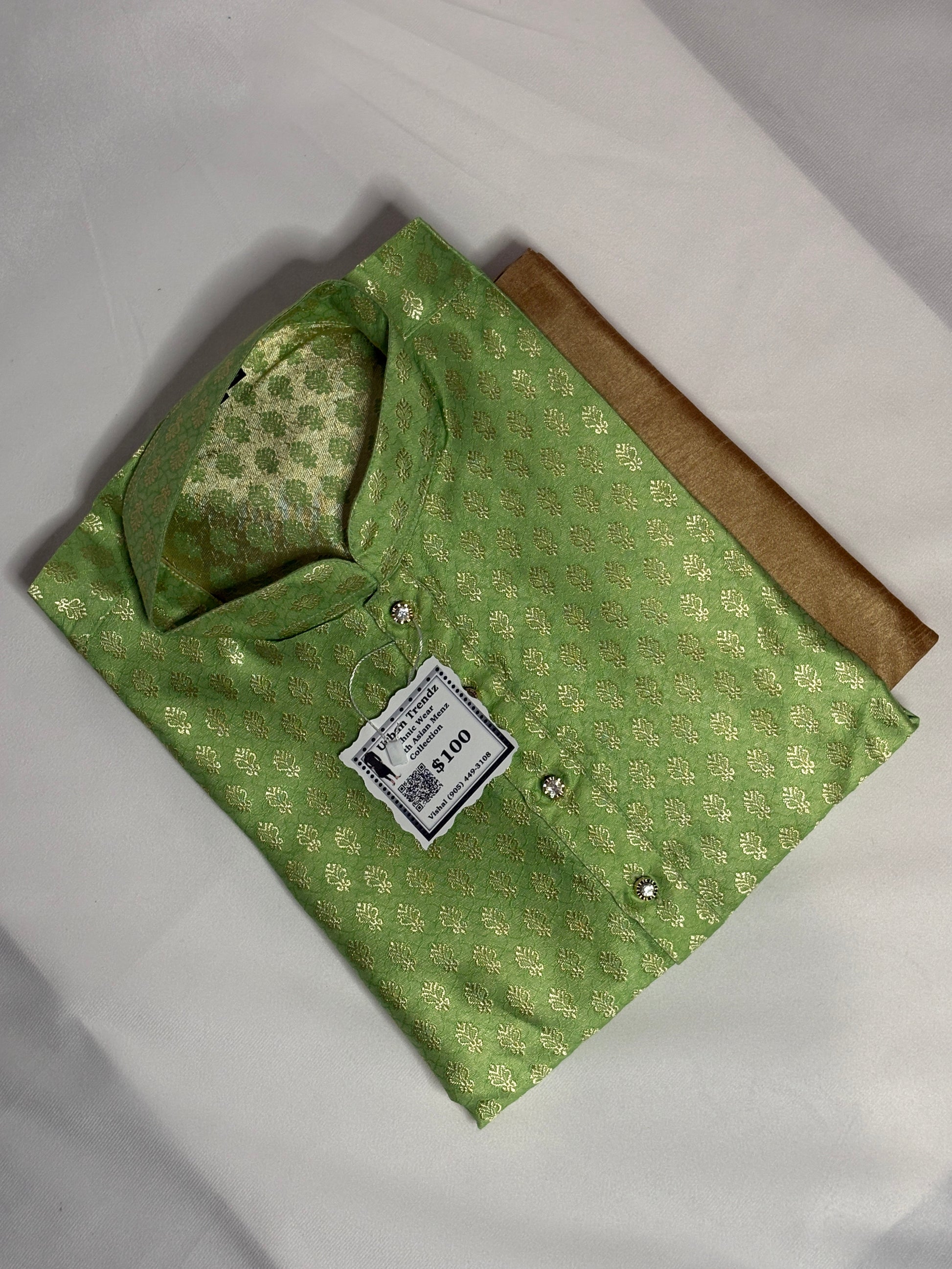 This is an exquisite brocade kurta pajama set in a refreshing color! Beautiful mint green - a fresh, elegant shade that's perfect for spring and summer celebrations. This color is increasingly popular for modern ethnic wear. Premium brocade fabric with a luxurious sheen and texture. All-over intricate paisley motifs woven in gold/silver thread throughout the fabric. The brocade pattern creates a rich, dimensional look with traditional Indian craftsmanship. Golden raw silk pajama (visible on the left) in a complementary golden tone. Full-length sleeves with the same brocade pattern.