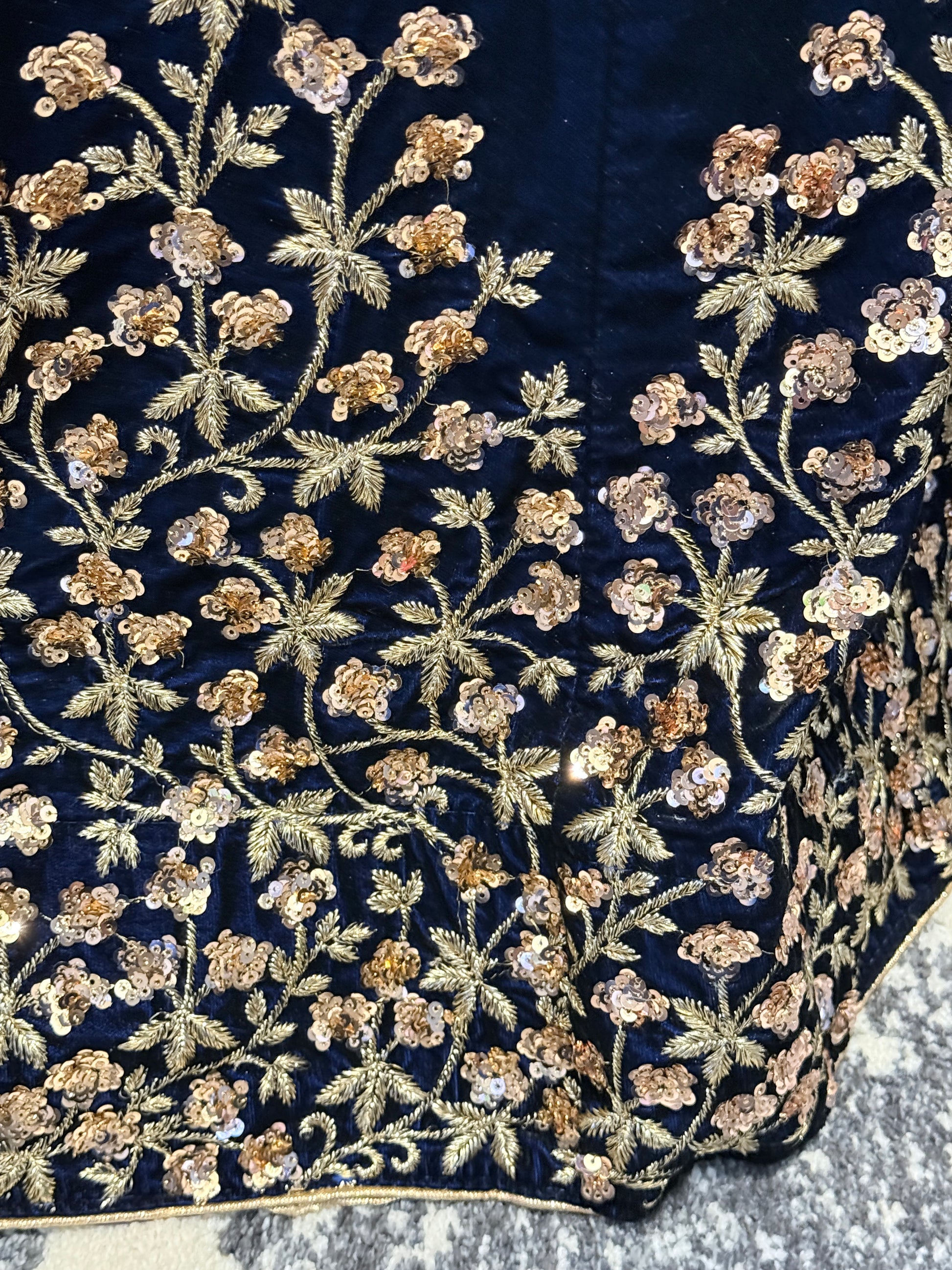 Make a majestic statement in this stunning navy blue velvet lehenga ensemble, adorned with exquisite golden sequins embroidery that creates a breathtaking contrast. Perfect for weddings, receptions, and grand celebrations where you want to exude timeless elegance.