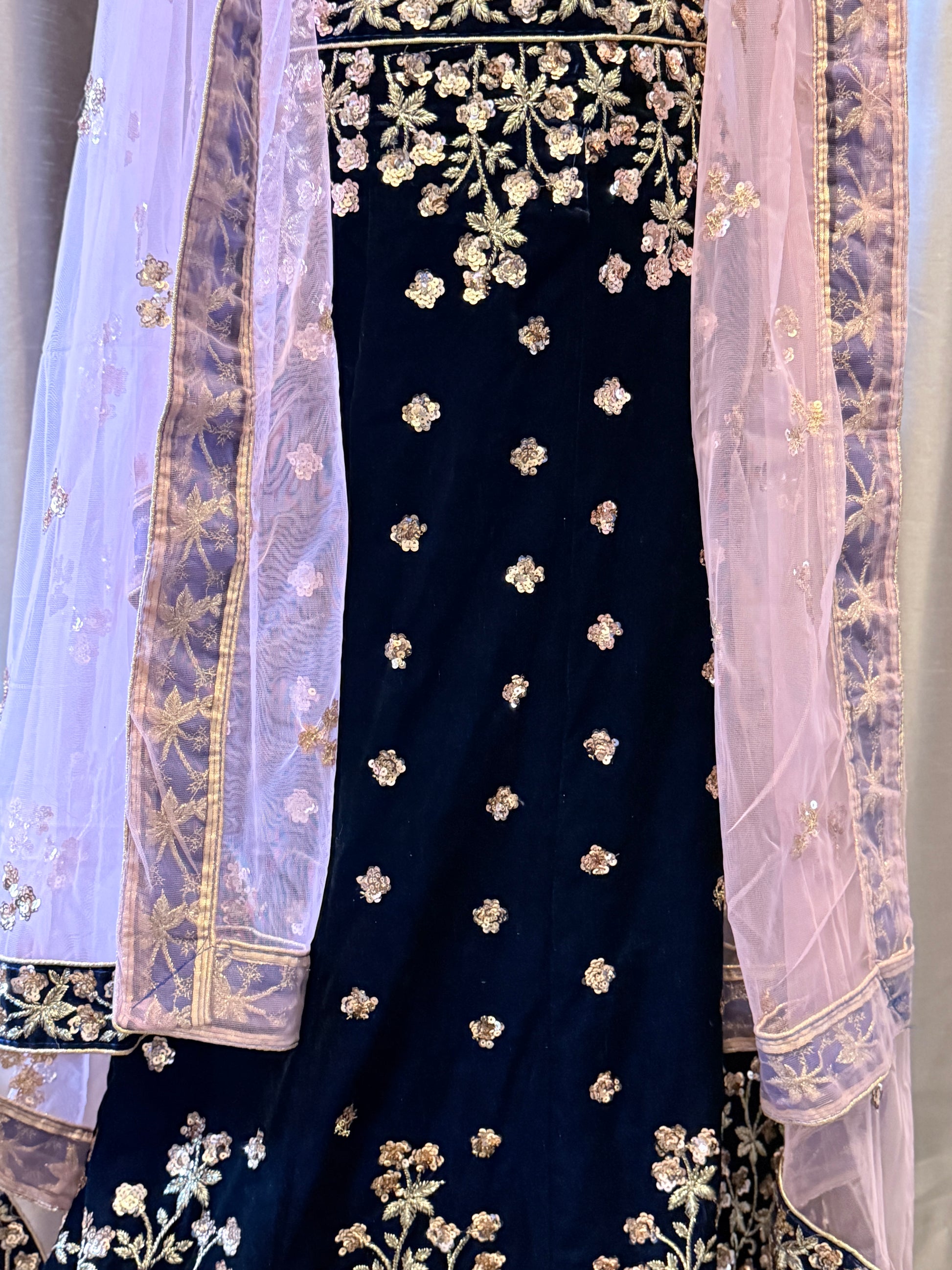 - Beautiful light pink net dupatta for a soft, romantic contrast to the navy velvet