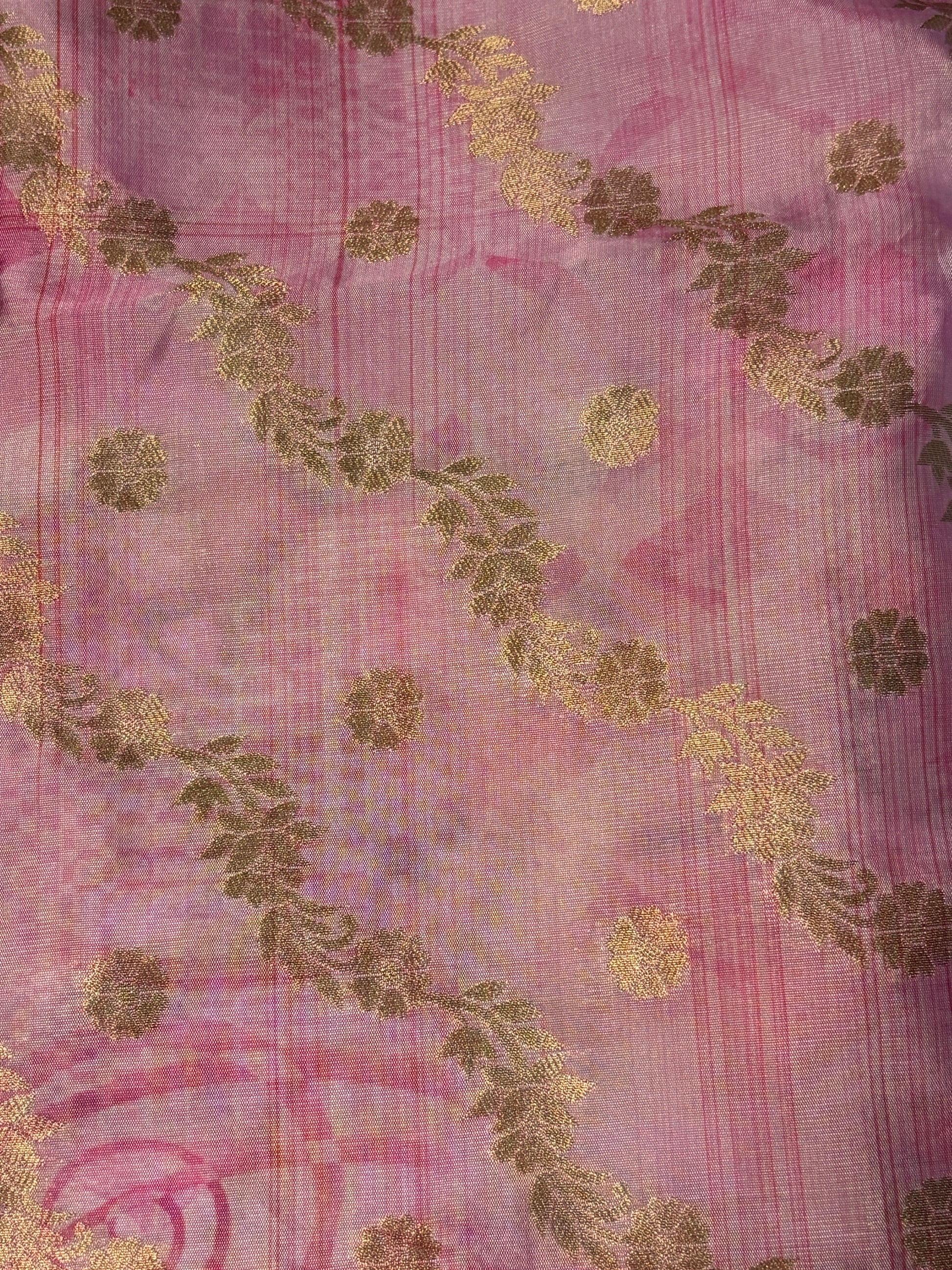 A graceful blend of heritage and modern artistry, this dupatta features a digitally printed floral centrepiece in vivid tones of red, saffron, and green. The soft pink base is enriched with traditional Banarasi-style golden motifs, adding a touch of regal charm.